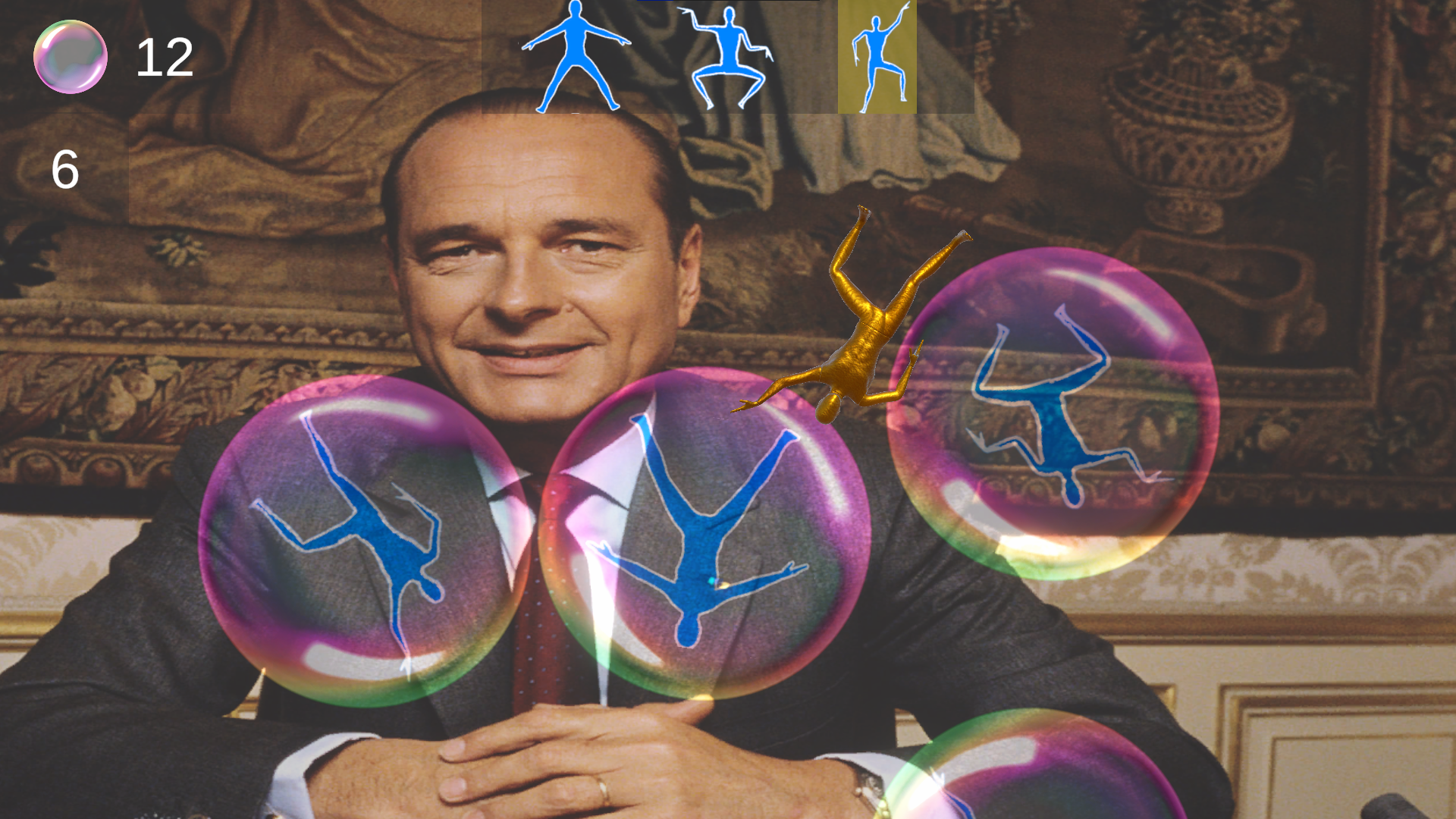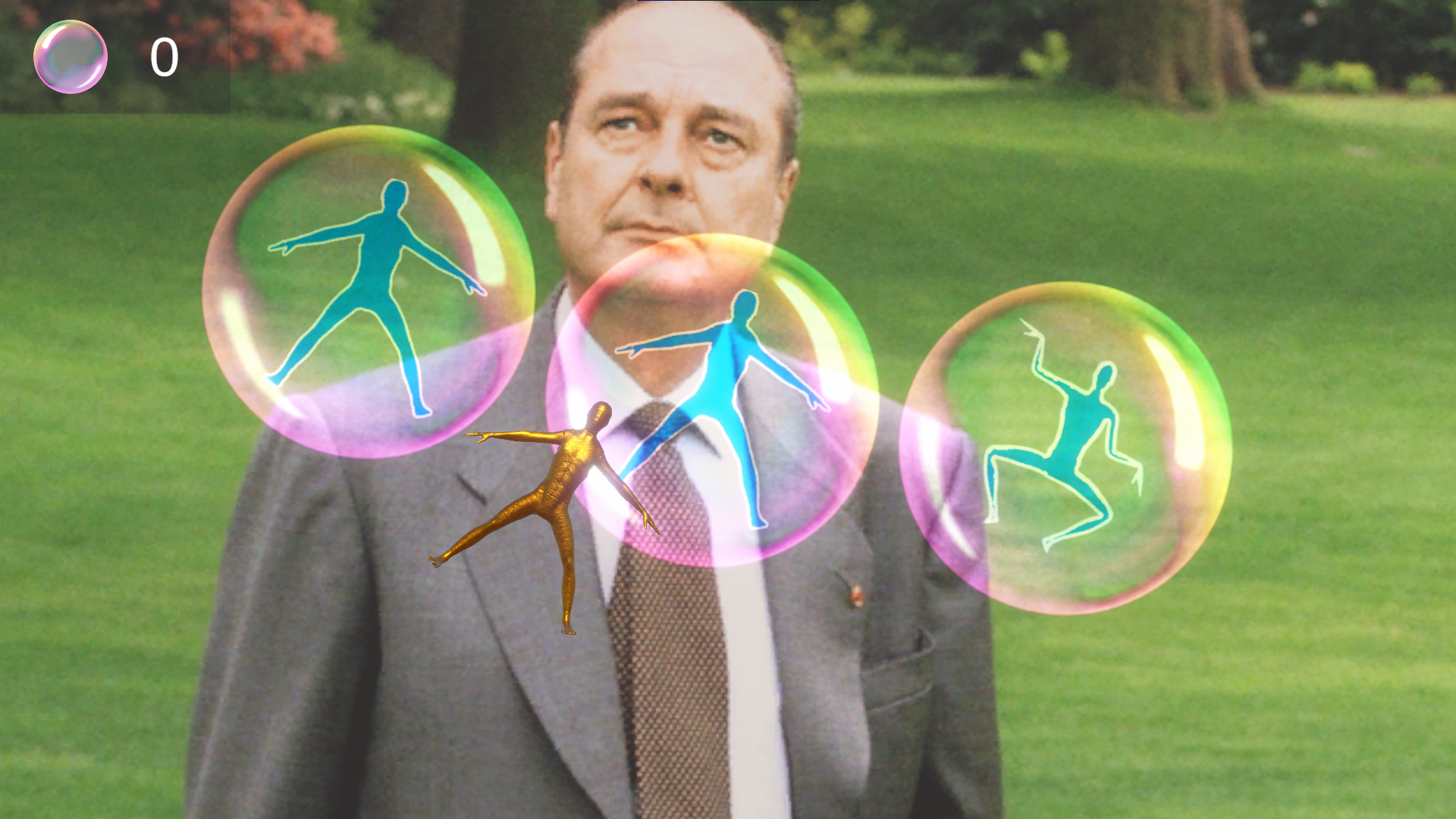 A Poser Posing is an arcade game where you play as a golden mannequin wich sole purpose is to pop bubbles in front of Jacque Chirac.